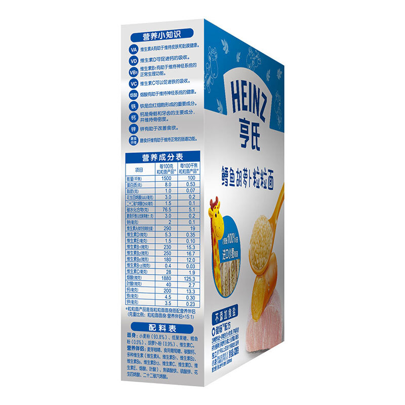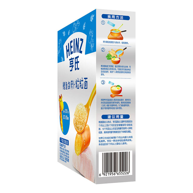 亨氏 (Heinz) 嬰幼兒輔食 金裝粒粒面 含鱈魚(yú)胡蘿卜寶寶營(yíng)養顆粒面320g(無(wú)鹽)(輔食添加初期-36個(gè)月適用)-誠成商貿有限責任公司